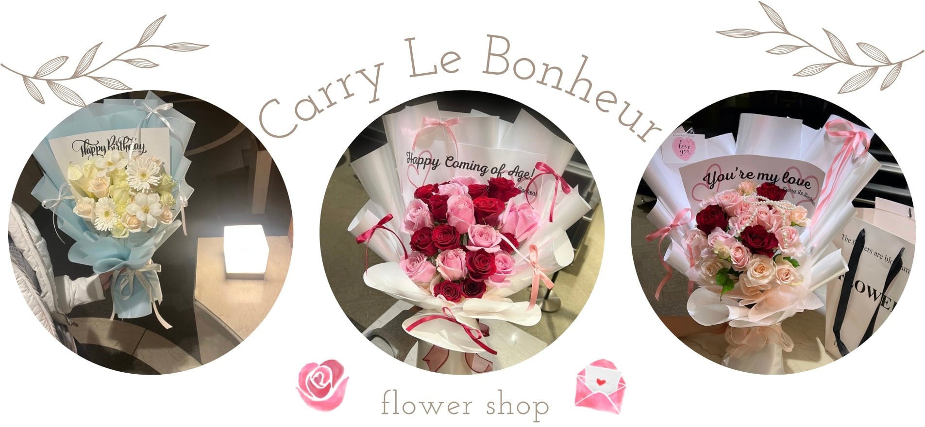 《♡入学リボンロゴ包装紙のワンホンブーケ♡》 【店舗受取専用】 リボンが描かれた入学メッセージの包装紙で作る、 普通の花束とはちょっと違った可愛すぎるワンホンブーケ…♡‧⁺ ◇Standard size…お花10本前後 ◇Lage size…お花15〜20本前後 ※お花の種類に関してはバラ+おまかせになっております。 ※ご希望のお花の色味を選択してください。 ※水色/黒/レインボーなどの特殊なお花の場合は別途料金追加になります。 ・卒業メッセージロゴ包装紙 ・ハートバルーン(standard1つ/Large size2つ) ・細リボン ・卒業メッセージカード {♡こちらの4点込みの可愛いブーケ♡} ※デコレーション[細リボン/バルーン]ご希望のカラーがある場合は備考欄に記入お願い致します。 ※デコレーション[細リボン/バルーン]ご希望のカラーの記入が無い場合はこちらでお花に合わせてお作りさせて頂きます。 〜〜〜注意事項必ずお読みください〜〜〜 ◆店舗受取のご注文ご希望の方は店舗受取様のご商品のご購入orご公式LINEからお問い合わせください。 ◆商品受取の日時設定を必ずしてください。 ※店舗受け取りの場合は配送ご希望時間の時間帯に、店舗受取になります。 ※ご注文完了後に公式LINEに(お名前/受取時間)を記入してご連絡ください。 ◆指定できない日時をご希望のお客様は、備考欄に必ずお書き下さい。(決済完了されてから3日後より日付指定可能です) ※直前のオーダーに関しては公式LINEからお問い合わせお願い致します。 ◆発送は生花の為、発送はクール便を使用致します。 北海道・九州地方・四国地方・離島の方は、到着予定が+1日日数がかかります。 ◆ご注文後決済完了されてから最短4日以内に発送致します。 ◆当店の商品は全てスタッフが1から手でお造りしております。同じ商品でも少しずつ若干の個体差があることをご了承下さい。 ◆当店のお花は生花を取り扱っております。 プリザーブドフラワー/造花/ソープフラワーでの作成希望のお客様は公式LINEからご注文のお問い合わせをお願い致します。 ◆【生花の花束ご注文のお客様】 生花の花束は、配送でお客様のお手元に届くまで、時期により痛みが生じたりする場合がございます。 なるべくお花が傷まないようにクール便での発送になりますが、季節や気温によりダメージがつく場合がございます。ご了承くださいませ。 ◆当店の商品は生花などを使用している為、商品返品&返金などは基本的に行なっておりません。 ◆生花の為、お届けはお客様が必ず受け取りできる日時でお願い致します。 ◆注文後、ご指定の配送到着の5〜7日前まではキャンセル料がかかりません。5〜7日過ぎてしまうと手配完了してしまう為、キャンセル料金が全額かかります。 【ご質問などございましたら、公式LINEまたはお問い合わせフォームからご連絡お願い致します】